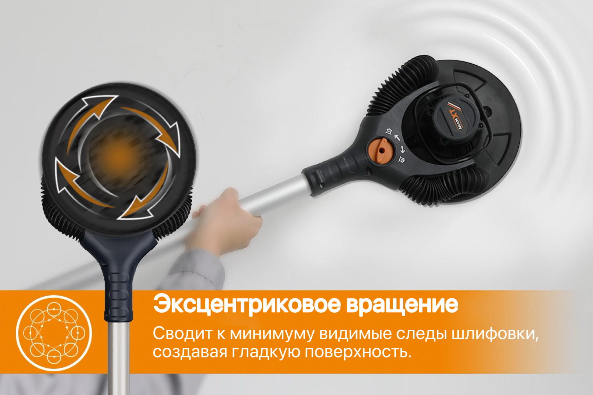 Профессиональная шлифмашина мощностью 400 Вт, оснащённая шлифовальной тарелкой диаметром 225 мм (9”) с эксцентриком 5,0 мм.
