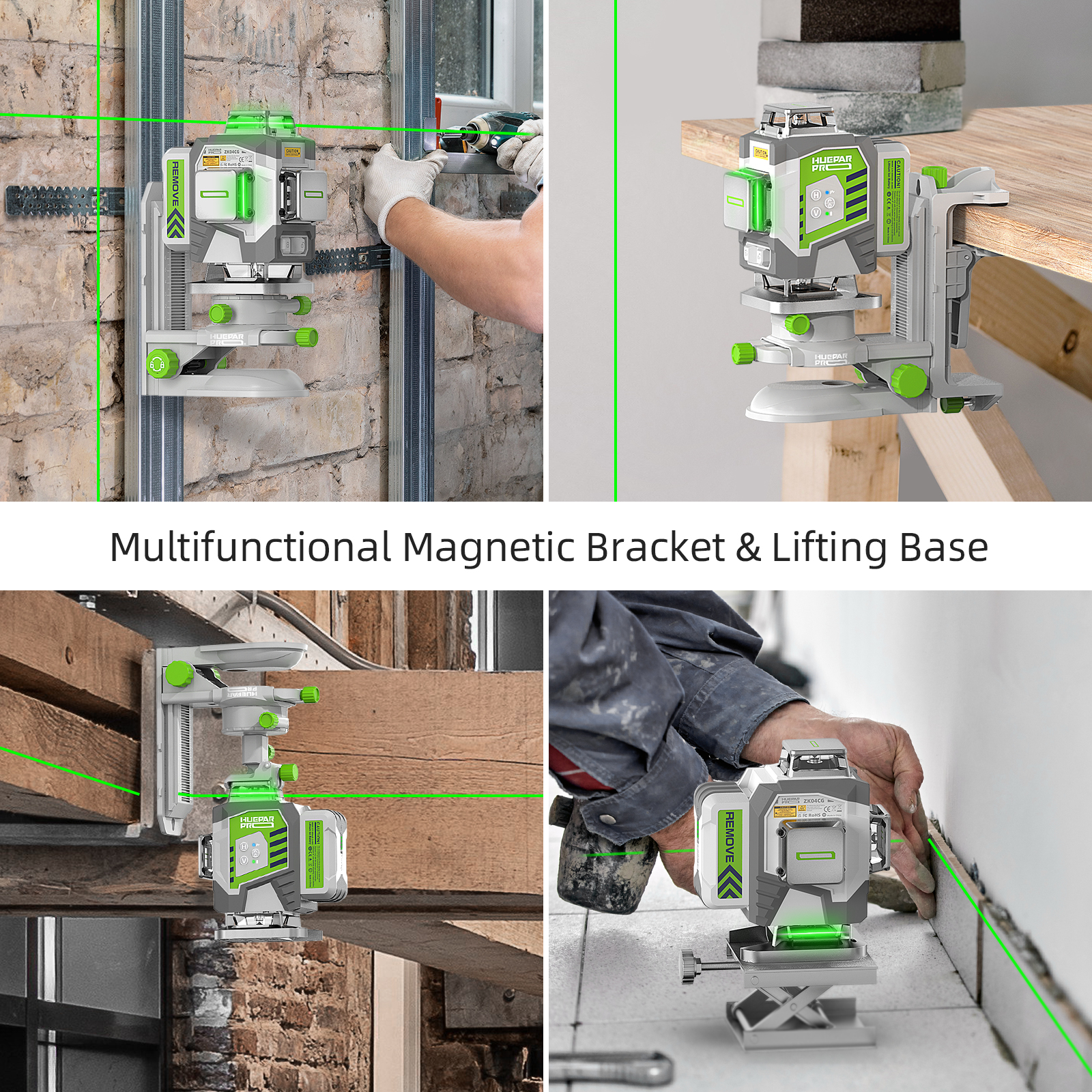 Construcția metalică robustă a dispozitivului oferă protecție suplimentară. Nivela laser Huepar ZK04CG are un grad de protecție IP54, protejându-o de praf și umiditate. Include un suport magnetic multifuncțional cu reglare fină, permițând utilizarea sa atât pentru aplicații pe tavan, cât și pe perete. Sunt incluse și diverse accesorii, inclusiv ochelari pentru o vizibilitate îmbunătățită a laserului, un adaptor magnetic și o platformă de ridicare (lift).